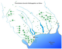 Unter Katharina II. wurden bis 1768 zwischen 25 und 30 Tausend Kolonisten aus Südwestdeutschland angeworben, die mehrheitlich aus dem pfälzischen Raum und der Mittelgebirgsregionen stammten. Zar Alexander I. (1801 – 1825) setzte die Kolonisation der Schwarzmeerregion weiter fort. So gelangten noch während der Napoleonischen Kriege Immigranten in den Süden Russlands, zwischen 1804 und 1842 insgesamt an die 11 000 Familien. Ein Nebenstrang dieser Migrationsbewegung war die Aufnahme von 70 Pfälzer Familien auf Krongütern in Livland. Zar Alexander I. setzte die Peuplierungspolitik fort: 1804-1842 gelangten mehr als 11 000 Familien in die Schwarzmeerregion und in den südlichen Kaukasus, seit 1814 auch nach Bessarabien. Insgesamt gab es über 100 Siedlungen von Koloinsten an der Wolga und um Odessa herum (vgl die beiden Übersichtskarten).[Anm. 5]