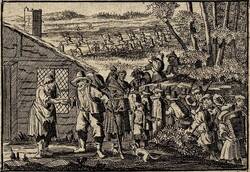 Insgesamt machten sich nach der Erntekrise von 1708/09 rund 13.000 Menschen auf den Weg nach England.[Anm. 2] Ausgelöst wurde diese Auswanderungswelle durch eine Werbeschrift des Pfarrers Josua Harrsch aus Eschelbronn im Kraichgau. Harrsch hatte 1704 auf einer Englandreise erfahren, dass Königin Anna deutsche Siedler für ihre nordamerikanischen Kolonien suchte.[Anm. 3] Im Auftrag von englischen Großgrundbesitzern, die eine rasche Erschließung ihrer Ländereien in Nordamerika erhofften, verfasste Harrsch nach seiner Rückkehr unter dem Pseudonym Josua Kocherthal eine Flugschrift mit dem Titel „Ausführlich- und umständlicher Bericht von der berühmten Landschafft Carolina in dem Engelländischen America gelegen.“[Anm. 4] Darin schilderte er die Vorzüge der Neuen Welt in den höchsten Tönen. Die Flugschrift fand reißenden Absatz und erlebte vier Auflagen.