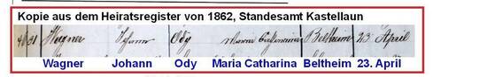 De acordo com os registros familiares e eclesiásticos da Diocese de Trier, João Wagner (2) era agricultor (registrado pela última vez como trabalhador rural em uma fazenda em Beltheim). Ele queria emigrar (ou emigrou) para o Brasil em 1862, e era solteiro na época, mas estava prestes a se casar. Ele se casou com Maria Catharina Ody em 24 de abril de 1862 em Beltheim, Prússia, como pode ser visto na Figura 9:
