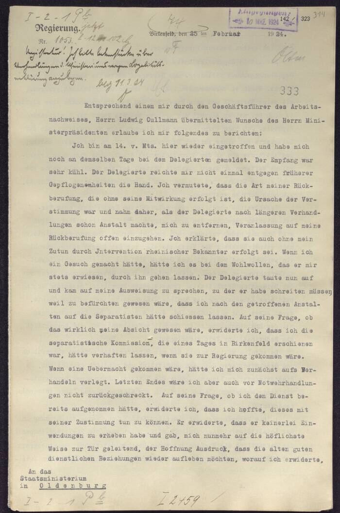 1.1.Bericht des Regierungspräsidenten Dörr an das Staatsministerium des Freistaates Oldenburg vom 25. Februar 1924