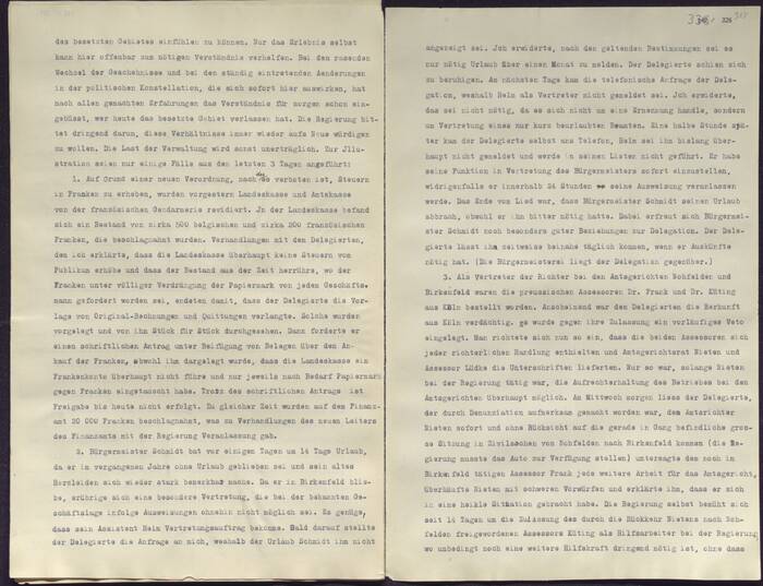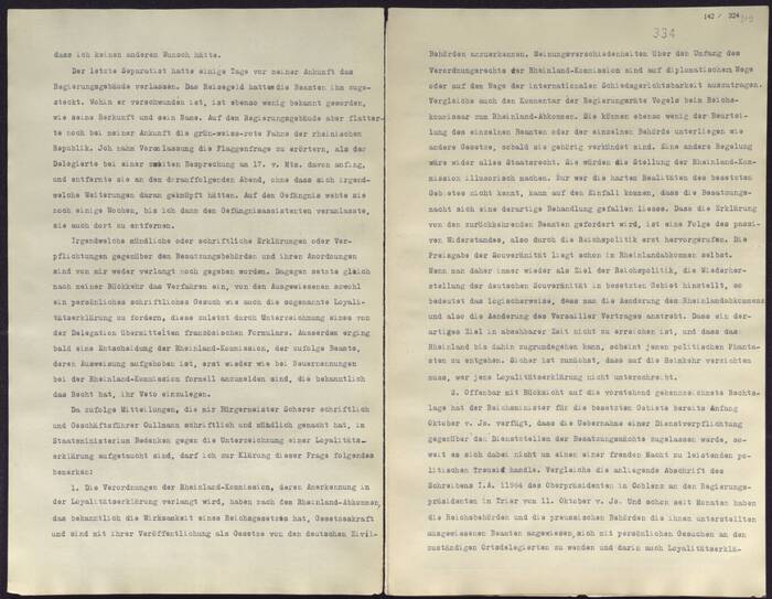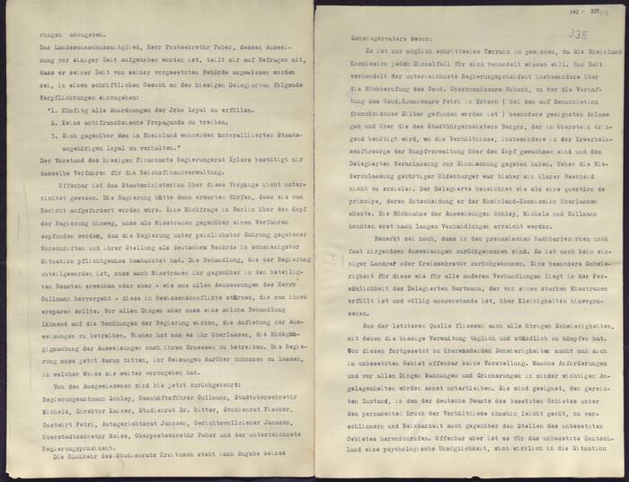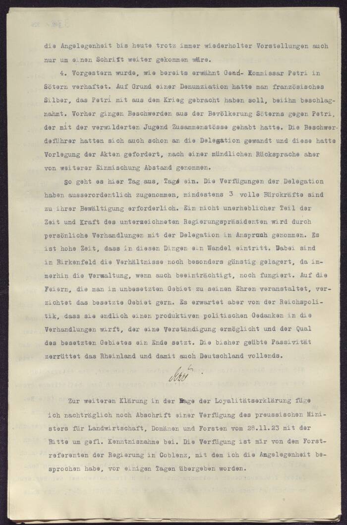 Walther Dörr, Regierungspräsident des oldenburgischen Landesteiles Birkenfeld, wurde am 26. Oktober 1923 von der französischen Besatzungsmacht ins unbesetzte rechtsrheinische Gebiet ausgewiesen. Nach seiner durch "Intervention rheinischer Bekannter" erfolgten "Rückberufung" nach Birkenfeld am 14. Januar 1924 meldet sich Dörr beim französischen Militärverwalter Major Bastiani zurück. Während der anschließenden Unterredung gibt er zu, im Vorfeld der Ausrufung der "Rheinischen Republik" in Birkenfeld (30. Oktober) im Falle einer Konfrontation mit einer separatistischen "Übermacht" vor "Notwehrhandlungen", wie dem Gebrauch von Schusswaffen, nicht zurückgeschreckt zu haben. Infolge seiner Anordnung von Schutzmaßnahmen für die öffentliche Verwaltungs- und Dienstleistungseinrichtungen setzt sich Dörr - so meldet Paul Tirard, Frankreichs Hoher Kommissar in der Alliierten Rheinlandkommission in Koblenz für die besetzten linksrheinischen Gebiete, seiner Regierung in Paris - "höchstpersönlich an die Spitze der Gegenkundgebungen" und trägt damit "zur Störung der bislang im vollen Umfang gewährleisteten öffentlichen Ordnung bei". [Anm. 1] Am 26. Oktober wird Dörr ins unbesetzte rechtsrheinische Gebiet ausgewiesen. Dieselbe Maßnahme trifft Birkenfelder Beamte, die in den folgenden Tagen der "Rheinischen Republik" die Gefolgschaft verweigern.