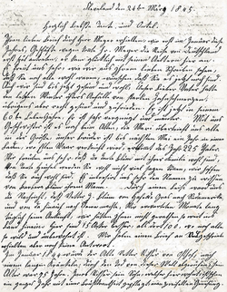 Ihren lieben Brief durch Herr Meyer erhielten wir erst im Januar dieses Jahres, Geschäfte wegen konnte hr. Meyer die Reise von Deutschland erst spät antreten; er kam glücklich mit seinen Aeltern hier an. Es freut uns sehr, wie wir aus Ihrem lieben Schreiben sehen, dass Sie noch alle wohl waren, wünschen daß Sie es jetzt noch sind. Auch wir sind bis jetzt gesund und wohl, unser lieber Vater hatte den letzten Winter öfters Anfälle von starken Zahnschmerzen; übrigens aber recht gesund und zufrieden. Er ist jetzt in seinem 60ten Lebensjahre. Er ist sehr vergnügt und munter. Mit uns Geschwister ist es noch beim Alten, die Mari übertrieft uns alle in der Größe, unser Bruder ist bis nächsten Mai ein Jahr in einem Laden, wo Ellen Waar verkauft wird, er bekommt das Jahr 225 Thaler. Wir freuten uns sehr, daß die Tante Blum mit ihrer Familie wohl sind, Von Tante Heuchel werden Sie wohl nicht viel sagen können, wir hoffen daß Sie auch wohl sind. Es intresirt uns sehr den Namen zu wissen von Barbara Blum ihrem Mann. Durch einen Leisi ward uns die Nachricht, daß Vetter G. Blum von Haferde Gras nach Südamerika, und von da hinauf nach Iowa machte. Wir erwarteten Monate lang täglich seine Ankunft, wir hätten Ihnen nicht gerathen so weit ins Land hinein. Hier sind 15 Acker besser, als dort 100, wo noch alles so wild und unbewohnt ist. Wir haben einen Brief an V.B. geschrieben erhielten aber noch keine Antwort.