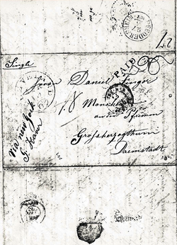 Barbara Finger (* 01.09.1813 in Wachenheim, † [?] USA) schreibt im März 1845 aus Cleveland, Pennsylvania in die alte Heimat. Empfänger ist das mennonitische Ehepaar Daniel Finger (* 25./26.06.1800 in Wachenheim, † 12.05.1866 in Monsheim) und Anna Marie Möllinger, verw. Krebül (* 20.10./11.1783 in Monsheim, † 03.10.1871 ebd.). Daniel Finger war Müller in der Oberen Schlossmühle und Gutsbesitzer in Monsheim.