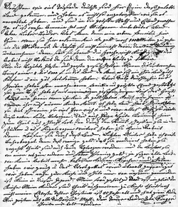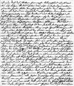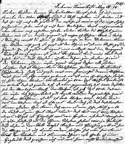 ist nur daß daß Wetter hier mehr Abwechslend ist als wie bei euch Letzen Winter haben wir sehr unbestandiges wetter zuweilen große Kälte dann gleich wieder gelinde dann Regen und Schnee so daß es ein ungesundes wetter war. dann haben wir bis gegenwärtig ein sehr Trockenes und kaltes frühjahr. so daß die Winterfrüchte keine Reichliche Ernde Versprechen. Wir säen hier im September und Ernten im Monat July Jetzt sind wir Beschäftigt im Welschkorn Pflanzen Das Land wird zwei Wegen ausgefurcht und dann stock für stock geplantzt eine Langsame Arbeit: Welschkorn kann mehr Heiß Vertragen als einige andre früchte und ist der sommer warm und nicht zu naß und der frost kommt nicht vor dem Mittel September so Bekommen wir allzeit eine Reichliche Ernte. So habe ich dir nun zimlich unsre Gegend Beschrieben wie sie ist es eine Rechte gesunde Landschaft ich wohne hier wie ich dir schon geschrieben auf meine Schwiegerfatter seine guth daß ich vom Ihm gekauft habe: er ist Letzes Spätjahr gestorben. zwei andre Schwäger haben die andre güther: die Mutter hat ihr guth bei sich selbst so lange sie lebt so habe ich dann meiner frau freunde alle um mich herum nur daß ich keine auf meiner seite hier habe Was ich schon oft Sehnlichst gewunschen habe. ich habe auch eine Brief vom unserem Schwager J. Finger erhalten sie sind noch alle gesund. und freuen sich schon meiner Gegenwart. dann ich habe ihm geschrieben ich werde so gottes willen ist ihn Diesen Sommer Besuchen. Und was daß Gelobte land betrift: Ja Lieber Bruder daß ist daß freie gelobte Land wir können alle 4 Jahre einen President wählen alle 3 Jahre einen Gouvernör alle Jahre die gesetzgebung ein jeder kann Reisen wo er hin will ein jeder kann sein geschäft aufsetzen wo und was er will. daß sind also die Haupt artikel von unsre freiheit. aber was Helfen den diese dem armen