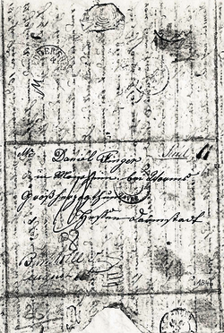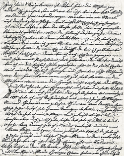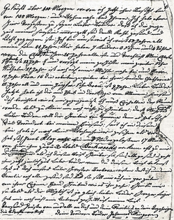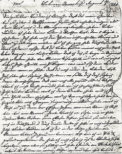 Gekauft über 400 Morgen wovon ich Jetzt ihm Besitzt bin von 198 Morgen: und Wohne nahe bei Ihnen. Ich habe aber Hier Vergessen zu sagen Lieber Bruder daß ich die ganze zeit meines hiersein immer gott sei Dank Recht gesund und Wohlgegangen ist: Ich bin nun so viel ich weiß 50 Jahre alt meine Frau 44 Jahre: Wir haben 7 Kinder 3 Söhne und 4 Töchter wovon die Elteste Christina schon 25 Jahre alte ist und Verehlicht mein Eltester Sohn Jacob ist 23 Jahr und versorgt meine geschäfte mein zweiter Sohn Wilhelm 21 Jahr ist noch auf einer Mühle nahe bei und Maria 18 Jahr Sara 16 die arbeiten zuweilen bei ihrer Freunde Chatharina 12 Jahre alt und mein jüngster Sohn Aron ist 9 Jahre: Lieber Bruder Jetzt habe ich dir ein Theil in der Kürze von Meinem hiersein dich berichtet wie es mir gegangen ist ich muß Einhalten der Raum werde bald zu Klein um noch mehr zu schreiben: daß Nächste mahl Lieber Bruder will dir schreiben von America denn es hat sich S[ehr] Viel Verändert bei meinem hiersein: seit ich in diesem [Land] bin habe ich noch kein Wachenheimer gesehen als vor J[ahren] hat sich Jacob Klaz bei uns Niedergelaßen. 17 Meile[n] von hier ihm zurück Wald (Backwoods) er kam oft zu mir er u[nd] seine Frau waren hier als ich diesen Brief schreibe. sie sind alle geßund u[nd] geht ihm jetzt zimlich gut Lieber Bruder wenn du diesen Brief bekomst laß es doch unsere Lieber Schwester Barbara wißen dass ich und meine Familie noch alle gesund sind und sie soll mir auch ein par zeilen von ihrer Eigenen Hand schreiben wie es ihr gehe: Schreibe mir so bald als dir Möglich ist ja gleich Lieber Bruder Schwager finger hat mir noch nicht eine Antwort geschickt auf meinen Brief.