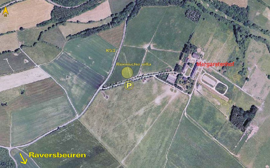 Anfahrt: Auf der B327 von Koblenz in Richtung Trier die Ausfahrt Ravensbeuren L193. In Ravensbeuren rechts auf die K80 in Richtung Briedel abbiegen. Im weiteren Verlauf rechts abbiegen auf die K53 nach etwa 400 rechts abbiegen in Richtung Margaretenhof. Nach kurzem Weg auf der linken Seite der Standort des römischen Gutshofs.
