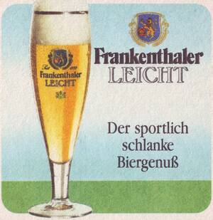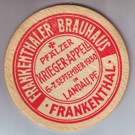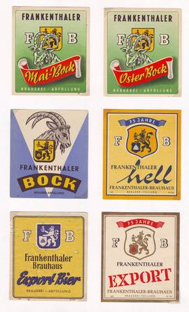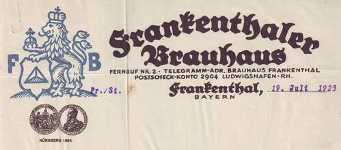 - Vgl. StAFt: Es gibt wieder Vollbier!, in: FTZ, 29.06.1921; StAFt: Best. XIII/10: Frankenthaler Brauhaus in Frankenthal, in: Münchener Neuste Nachrichten, 19.01.1927; StAFt: Best. XIII/10: Frankenthaler Brauhaus, in: Münchener Neuste Nachrichten, 07.01.1928; StAFt: Best. X/30/3-3: Plakat 1935; Christmann 2021, S. 49–50; Fischer/Herborn 1985, S. 99; Morlock 1964, S. 16. Zurück