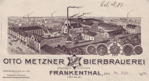 - Vgl. StAFt: Best. XIII/10: Frankenthaler Brauhaus AG., Frankenthal Pfalz, Z 35, 25.02.1932; Geschäftsbericht 1934/35, S. 4, 10; Christmann 2021, S. 56; Fischer/Herborn 1985, S. 100; Mayer 1940, S. 75–76, 198–199. Zurück
