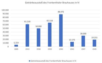 - Vgl. StAFt: Best. X/30/3-3: Geschäftsbericht 1950/51, S. 3; StAFt: Best. III/73/2 (1954–1959): Geschäftsbericht 1952/53, S. [3]; StAFt: Best. III/73/2 (1954–1959): Geschäftsbericht 1954/55, S. [3]; StAFt: Best. III/73/2 (1954–1959): Geschäftsbericht 1955/56, S. [3]; StAFt: Best. III/73/2 (1954–1959): Geschäftsbericht 1956/57, S. 3; StAFt: Best. III/73/2 (1954–1959): Geschäftsbericht 1957/58, S. 2; StAFt: Best. III/73/2 (1954–1959): Geschäftsbericht 1958/59, S. 2; StAFt: Best. XIII/10: Ereignis von wirtschaftlicher Bedeutung: Fünfundsiebzig Jahre Frankenthaler Brauhaus, in: Rheinpfalz, 03.04.1964. Zurück