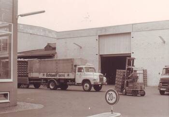 Anfang 1971 wurde das Frankenthaler Brauhaus schließlich Teil des Frankfurter Henninger-Konzerns, nachdem die von den Hamburger Reemtsma-Cigarettenfabriken beherrschte Henninger-Bräu KGaA die Aktienmehrheit am Grundkapital der Eichbaum-Werger AG übernommen hatte.[Anm. 83] 1972 wurde zudem mit Henninger ein Unternehmensvertrag abgeschlossen, nach dem das Frankenthaler Brauhaus an Eichbaum vorbei seine Gewinne direkt nach Frankfurt abzuführen hatte, aber auch mögliche Verluste von Henninger übernommen werden sollten.[Anm. 84] Zu Beginn der 1970er Jahre setzte sich der im vorherigen Jahrzehnt begonnene Aufschwungstrend im Braugewerbe zunächst fort (1971/72 wurde beim Brauhaus ein Ausstoß von 160.000 hl erreicht, 1976/77 die 200.000 hl), sodass das Unternehmen weitere Millionen DM in den Betrieb investierte, so 1970 in eine neue Stapelhalle mit Platz für 800.000 Flaschen, ein neues, gabelstaplerbetriebenes Plastikpalettensystem, eine vollautomatische Bierkästenanlage, EDV sowie eine verstärkte Öffentlichkeitsarbeit.[Anm. 85] Durch den neuen Status des Brauhauses als Konzerntochter waren 1974/75 von den nun ausgestoßenen 180.000 hl etwa 50.000 hl Lohnbräu für andere Brauereien des Konzerns; der Anteil an alkoholfreien Getränken steigerte sich bis 1975/76 zudem auf ca. 13 Prozent.[Anm. 86]