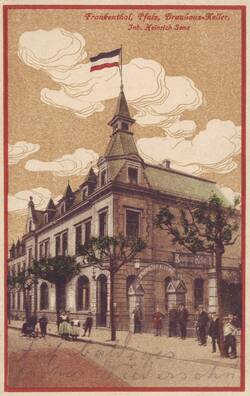 Wesentlicher Motor für die Expansion des Brauhauses waren die bis zum Ersten Weltkrieg stark ansteigenden Ausstoß- sowie Absatzzahlen (1912/13 erreichte der Bierausstoß mit 61.310 hl seinen vorläufigen Höhepunkt)[Anm. 18] welche nicht zuletzt auf einer ab der Jahrhundertwende verstärkten Gaststättenanwerbung seitens des Unternehmens beruhten: Bierlieferverträge mit Wirtshäusern, verbunden mit Kredit- und Darlehensvergaben durch die Brauereien, waren vor der endgültigen Durchsetzung des Flaschenbiergeschäftes Mitte des 20. Jahrhunderts die wichtigste Absatzmethode im Brauereigewerbe.[Anm. 19] Mit dem Brauhauskeller wurde 1900 zunächst ein eigenes Wirtshaus ins Leben gerufen.[Anm. 20] Insgesamt konnte das Frankenthaler Brauhaus bis zum Ersten Weltkrieg über 18 Absatzstätten durch Lieferverträge, Pacht oder Ankauf gewinnen, darunter zahlreiche bekannte Gaststätten bzw. Vereine in Frankenthal (so z. B. die Bahnhofswirtschaft, das Café Luitpold oder die Turnergesellschaft), aber u. a. auch in Mannheim, Frankfurt am Main, Ludwigshafen, Edenkoben, Worms sowie in Landau, wo bereits zuvor eine Niederlassung der Brauerei entstanden war.[Anm. 21] Vereinzelte Brauhaus-Kunden bzw. -abnehmer gab es zudem in Braunschweig, Wolfenbüttel, Hamburg und Köln; überdies hegte das Frankenthaler Brauhaus Absatzpläne für die Niederlande.[Anm. 22]