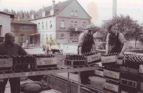 Ende 1949 konnte das Frankenthaler Brauhaus wie auch die anderen pfälzischen Brauereien wieder Vollbier herstellen.[Anm. 68] Erst einige Zeit nach der Währungsreform zur D-Mark 1948 sowie einer Biersteuersenkung im September 1950 und der Verbilligung der Rohstoffe erfolgte ein stetiger Anstieg von Ausstoß (bis auf 71.000 hl 1960), Absatz und Gewinn in den 1950er Jahren.[Anm. 69] Dadurch konnte auch wieder stärker in die Modernisierung der Produktionsanlagen sowie Rationalisierungsmaßnahmen investiert werden, u. a. in den Wiederaufbau der im Krieg zerstörten Lagerhalle, einen neuen Brunnen, den Ausbau des Lkw-Fuhrparks und den Neuerwerb von Gaststätten, aber auch in das stetig expandierende Flaschenbiergeschäft.[Anm. 70] Hierfür wurden ein Flaschenbierkeller, eine Flaschenabfüll- und -waschanlage sowie eine Etikettierungsmaschine benötigt.[Anm. 71]