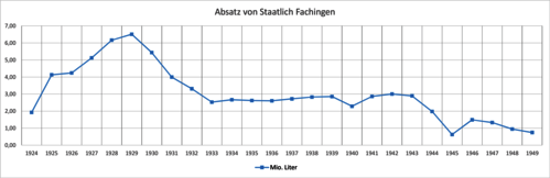Anfänglich verkaufte das Unternehmen weniger als eine Million Liter Heilwasser im Jahr. Der Absatz konnte bis zum Ausbruch des Ersten Weltkrieges 1914 auf über sechs Millionen Liter gesteigert werden. Im Jahr der Ruhrkrise und der völligen Entwertung der deutschen Währung 1923 konnte kaum noch Heilwasser verkauft werden. Bis 1929 erholte sich Staatlich Fachingen kurzzeitig, fasste aber ab der Weltwirtschaftskrise in den frühen 1930er Jahren, im Gegensatz zu anderen Mineralbrunnen, [Anm. 9] nicht mehr Fuß bei den Verbrauchern und setzte jährlich nur 2 bis 3 Mio. Liter ab. Dennoch beschäftigte Fachingen Zwangsarbeiter. [Anm. 10] Die Quellen dokumentieren allerdings Spannungen zwischen dem NS-Regime; so musste der Brunnen Niederselters 1942 der SS überlassen werden [Anm. 11] und die Verlängerung der Pacht fand nur kurzzeitig und kurzfristig statt. [Anm. 12] Dadurch gab es für den Pächter wenig Anreiz, größere Investitionen durchzuführen.