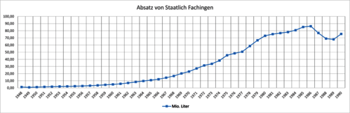 Trotz des großen Absatzes betonte Fachingen die besonders hohe Qualität seines Heilwassers, das in eigenen grünen Flaschen verkauft wurde. [Anm. 17] Fachingen stellte 1986 einen Verkaufsrekord mit 86,4 Mio. Litern auf. Danach kam es zu einem Rückgang. In Fachingen arbeiteten zu dieser Zeit fast 100 Beschäftigte. [Anm. 18]