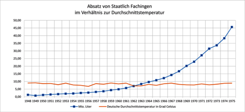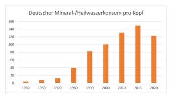 Erst mit der Investition von Staatlich Fachingen in neue Maschinen [Anm. 15] konnte ab der zweiten Hälfte der 1950er Jahre der Verkauf stetig gesteigert werden und überschritt 1965 10, 1969 20, 1977 sogar 50 Mio. Liter. Hierzu wurden unter finanzieller Beteiligung des Eigentümers, des Landes Rheinland-Pfalz, zahlreiche weitere Wasservorkommen erschlossen. Dieser große Erfolg von Fachingen steht in Zusammenhang mit der Entwicklung des gesamten Mineralwassermarktes, das sich von einem Luxusgut zum Massenkonsumartikel wandelte. [Anm. 16]