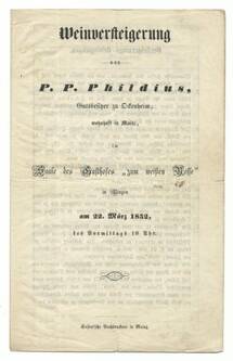 - Gutsbuch 1852; Einladung zur Weinversteigerung von P. P. Phildius vom 22. März 1852 in Bingen. Zurück