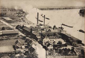 Die Gründung der Vereinigten Strohstoff-Fabriken AG mit Sitz in Dresden erfolgte 1885. Durch Zusammenschlüsse vereinigte sie deutschlandweit acht Standorte. Die Aktiengesellschaft übernahm auch die Fabrik in Rheindürkheim, deren Einbringungswert 698.111 Goldmark betrug.[Anm. 2] Bald wurden die kleinen Standorte geschlossen und es verblieben die größeren Werke in Coswig, Dohna und Rheindürkheim. 1930 wurde das Werk Rheindürkheim modernisiert, ausgebaut und der Grundbesitz auf 35 ha erweitert.[Anm. 3] Das von der Wasserversorgung ungünstig gelegene Werk in Dohna wurde infolge der Weltwirtschaftskrise 1929 stillgelegt, 1932 in ein Verpackungspapierwerk umgebaut und 1937 verkauft.[Anm. 4] Aufgrund des Zweiten Weltkrieges wurde der Betrieb ab Ende 1940 zeitweise unterbrochen und schließlich komplett eingestellt. Erst Anfang 1948 konnte die Produktion wieder aufgenommen werden.